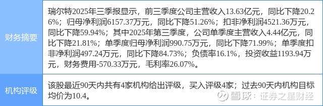 2025年10月29日,华安证券研究员徐偲,余倩莹发布了对瑞尔特的研报《25Q3业绩承压,积极布局装配式卫浴空间》,该研报对瑞尔特给出“买入”评级。研报中预计公司2025-2027年营收分别为19.31/21.63/23.75亿元(前值为20.29/22.73/24.97亿元),分别同比变化-18.1%/+12.0%/+9.8%;归母净利润分别为0.95/1.27/1.54亿元(前值为1.27/1.53/1.77亿元),分别同比变化-47.3%/+32.7%/+21.4%;EPS分别为0.23/0.3/0.37元,截至2025年10月28日,对应PE分别为39.61/29.86/24.59倍。维持“买入”评级。证券之星数据中心根据近三年发布的研报数据计算,该研报作者对此股的盈利预测准确度为76.93%。