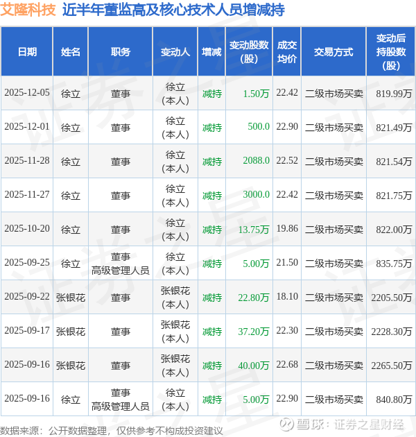 艾隆科技近半年内的董监高及核心技术人员增减持详情如下: