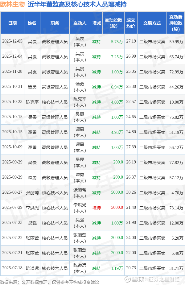 欧林生物近半年内的董监高及核心技术人员增减持详情如下: