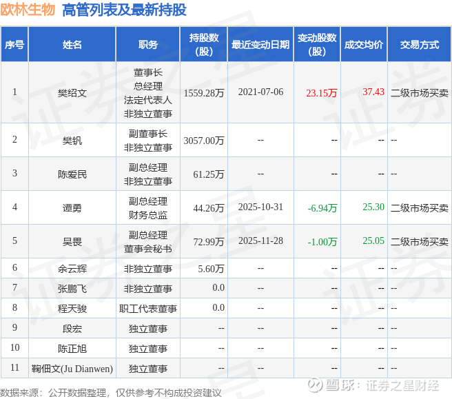 欧林生物的高管列表及最新持股情况如下: