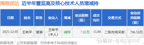 证券之星消息,根据12月8日市场公开信息、上市公司公告及交易所披露数据整理,海程邦达(603836)最新董监高及相关人员股份变动情况:2025年12月5日公司董事王希平共减持公司股份7.02万股,占公司总股本为0.0342%。变动期间公司股价下跌2.73%,12月5日当日收盘报14.59元。