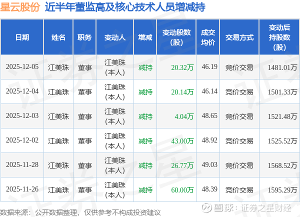 证券之星消息,根据12月8日市场公开信息、上市公司公告及交易所披露数据整理,星云股份(300648)最新董监高及相关人员股份变动情况:2025年12月5日公司董事江美珠共减持公司股份20.32万股,占公司总股本为0.1166%。变动期间公司股价上涨2.27%,12月5日当日收盘报46.93元。