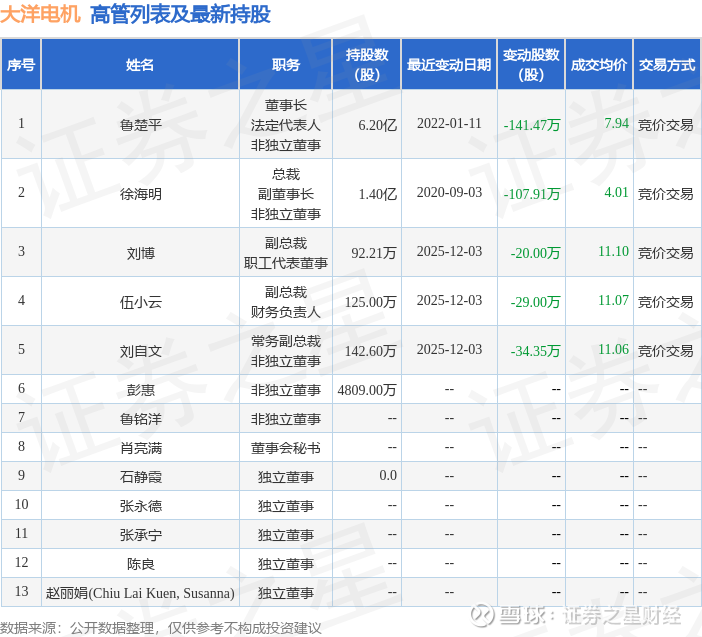 证券之星消息,根据12月8日市场公开信息、上市公司公告及交易所披露数据整理,大洋电机(002249)最新董监高及相关人员股份变动情况:2025年12月5日公司董事,高管刘博、高管伍小云、董事,高管刘自文共减持公司股份4.64万股,占公司总股本为0.0019%。变动期间公司股价下跌1.45%,12月5日当日收盘报10.9元。