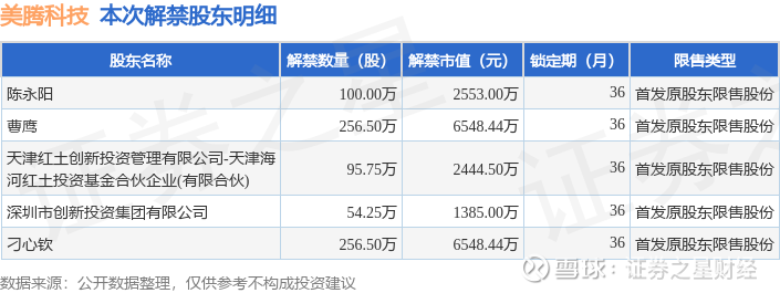 证券之星消息,根据市场公开信息整理,美腾科技(688420)于12月9日将有763.0万股限售股份解禁,为公司首发原股东限售股份,占公司总股本8.63%。(本次数据根据历史公告整理得出,实际情况以上市公司最新公告为准)最近一年内,该股累计解禁88.44万股,占总股本的1.0%。本次解禁后,公司还有4669.1万股限售股份,占总股本52.8%。具体如下图所示: