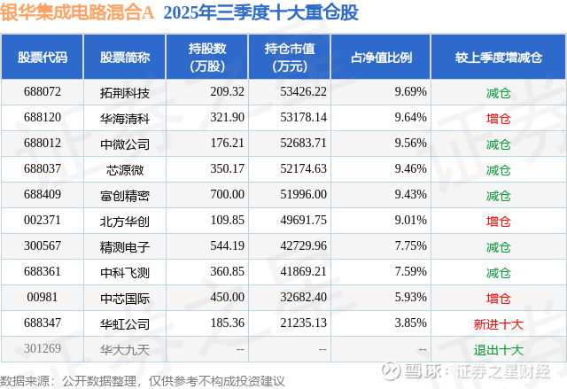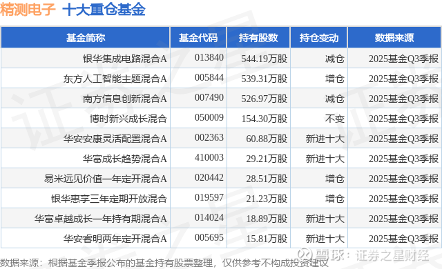 根据2025基金Q3季报公募基金重仓股数据,重仓该股的公募基金共37家,其中持有数量最多的公募基金为银华基金的银华集成电路混合A。银华集成电路混合A目前规模为23.54亿元,最新净值1.4769(12月8日),较上一交易日上涨1.63%,近一年上涨33.6%。该公募基金现任基金经理为方建。方建在任的基金产品包括:银华智荟内在价值灵活配置混合发起A,管理时间为2018年6月20日至今,期间收益率为211.88%;银华乐享混合A,管理时间为2021年6月22日至今,期间收益率为-10.27%;银华新锐成长混合A,管理时间为2022年3月31日至今,期间收益率为25.28%。