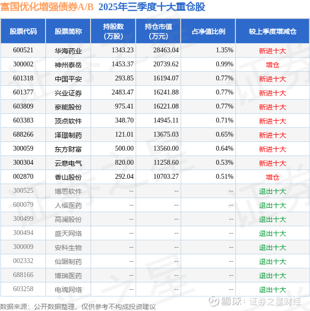 根据2025基金Q3季报公募基金重仓股数据,重仓该股的公募基金共3家,其中持有数量最多的公募基金为富国基金的富国优化增强债券A/B。富国优化增强债券A/B目前规模为49.41亿元,最新净值2.068(12月8日),较上一交易日上涨0.53%,近一年上涨16.64%。该公募基金现任基金经理为张育浩。张育浩在任的基金产品包括:富国悦享回报12个月持有期混合A,管理时间为2021年12月30日至今,期间收益率为15.79%;富国稳健双盈债券发起式A,管理时间为2022年12月21日至今,期间收益率为8.19%;富国双利增强债券A,管理时间为2025年2月26日至今,期间收益率为7.46%;富国稳健添利债券A,管理时间为2025年11月4日至今,期间收益率为-0.72%。