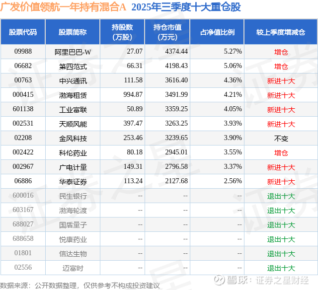 根据2025基金Q3季报公募基金重仓股数据,重仓该股的公募基金共1家,其中持有数量最多的公募基金为广发基金的广发价值领航一年持有混合A。广发价值领航一年持有混合A目前规模为6.65亿元,最新净值2.0907(12月8日),较上一交易日上涨0.72%,近一年上涨63.22%。该公募基金现任基金经理为杨冬 唐晓斌。杨冬在任的基金产品包括:广发多因子混合,管理时间为2021年7月2日至今,期间收益率为59.08%;广发成长智选混合A,管理时间为2023年8月21日至今,期间收益率为38.37%;广发稳健策略混合A,管理时间为2024年1月4日至今,期间收益率为54.9%。唐晓斌在任的基金产品包括:广发多因子混合,管理时间为2018年6月25日至今,期间收益率为377.42%;广发瑞誉一年持有期混合A,管理时间为2022年1月19日至今,期间收益率为60.96%;广发远见智选混合A,管理时间为2022年11月22日至今,期间收益率为-9.17%。