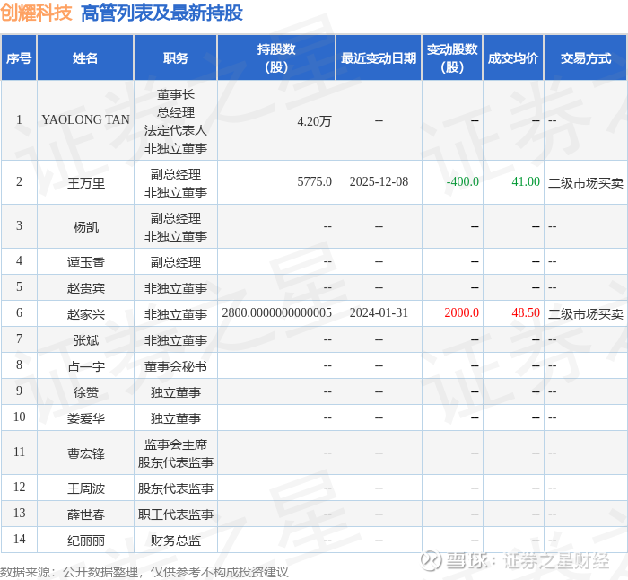 创耀科技近半年内的董监高及核心技术人员增减持详情如下: