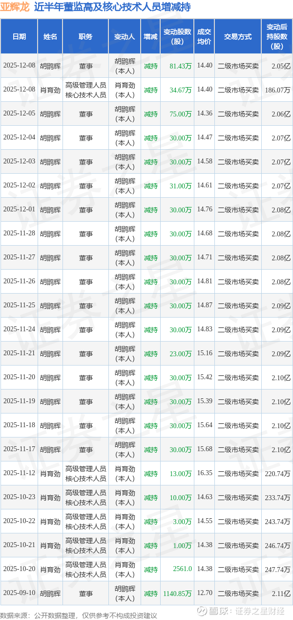 亚辉龙近半年内的董监高及核心技术人员增减持详情如下: