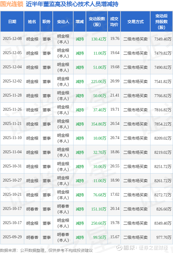 国光连锁近半年内的董监高及核心技术人员增减持详情如下: