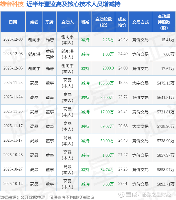 雄帝科技近半年内的董监高及核心技术人员增减持详情如下: