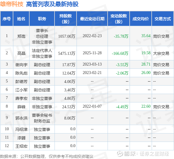 雄帝科技的高管列表及最新持股情况如下: