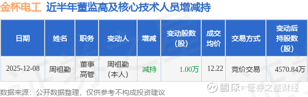 证券之星消息,根据12月9日市场公开信息、上市公司公告及交易所披露数据整理,金杯电工(002533)最新董监高及相关人员股份变动情况:2025年12月8日公司董事,高管周祖勤共减持公司股份1.0万股,占公司总股本为0.0014%。变动期间公司股价上涨0.33%,12月8日当日收盘报12.22元。