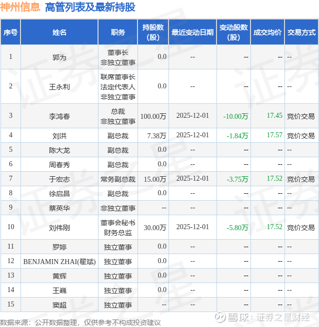 证券之星消息,根据12月9日市场公开信息、上市公司公告及交易所披露数据整理,神州信息(000555)最新董监高及相关人员股份变动情况:2025年12月8日公司董事,高管李鸿春共减持公司股份15.0万股,占公司总股本为0.0154%。变动期间公司股价上涨2.88%,12月8日当日收盘报17.52元。
