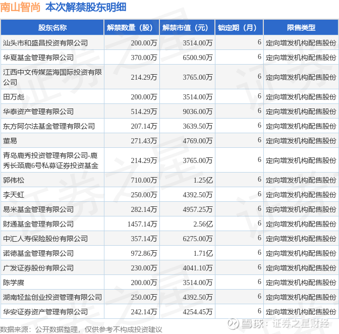 证券之星消息,根据市场公开信息整理,南山智尚(300918)于12月10日将有7142.86万股限售股份解禁,为公司定向增发机构配售股份,占公司总股本14.11%。(本次数据根据历史公告整理得出,实际情况以上市公司最新公告为准)本次解禁后,公司已无限售股份。具体如下图所示:
