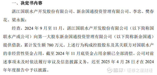 另外,广东证监局于今年11月向国联水产、新余国通及相关上市公司高管出具的《行政监管措施决定书》显示,2024年9月至11月,国联水产向新余国通提供借款,累计发生额780万元。该行为构成控股股东及其关联方对国联水产的非经营性资金占用,而上市公司迟至今年4月28日才在年报中予以披露。