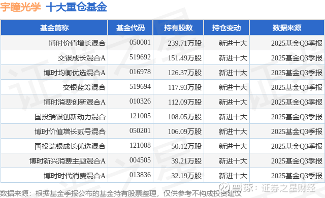 重仓宇瞳光学的前十大公募基金请见下表: