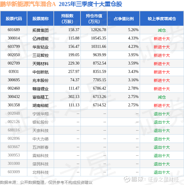 鹏华新能源汽车混合A的前十大重仓股如下: