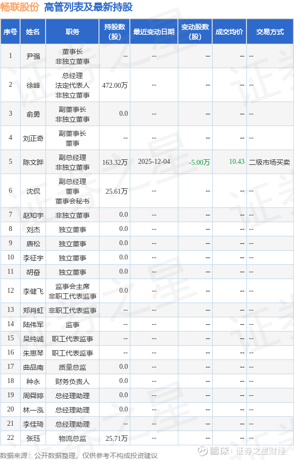 畅联股份的高管列表及最新持股情况如下:
