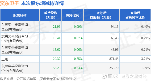 证券之星消息,12月10日奕东电子发布公告《奕东电子:关于控股股东、实际控制人的一致行动人减持股份触及1%整数倍的提示性公告》,其股东东莞奕宁投资咨询企业(有限合伙)、东莞奕萃投资咨询企业(有限合伙)、东莞奕合投资咨询企业(有限合伙)、王刚、东莞奕孚投资咨询企业(有限合伙)于2025年12月8日至2025年12月9日间合计减持234.64万股,占公司目前总股本的1.0%,变动期间该股股价上涨10.58%,截止12月9日收盘报46.09元。