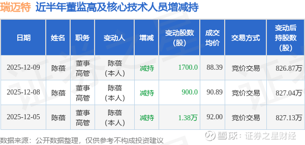 证券之星消息,根据12月10日市场公开信息、上市公司公告及交易所披露数据整理,瑞迈特(301367)最新董监高及相关人员股份变动情况:2025年12月9日公司董事,高管陈蓓共减持公司股份1700.0股,占公司总股本为0.0019%。变动期间公司股价下跌3.07%,12月9日当日收盘报88.1元。