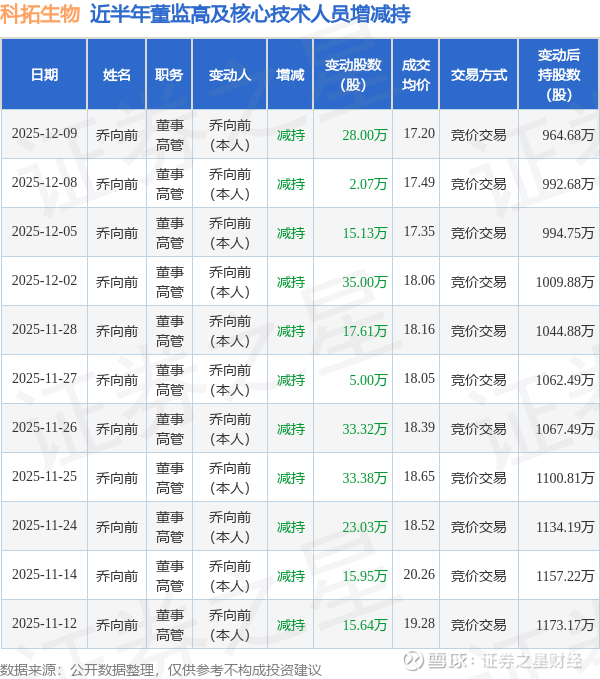 科拓生物近半年内的董监高及核心技术人员增减持详情如下: