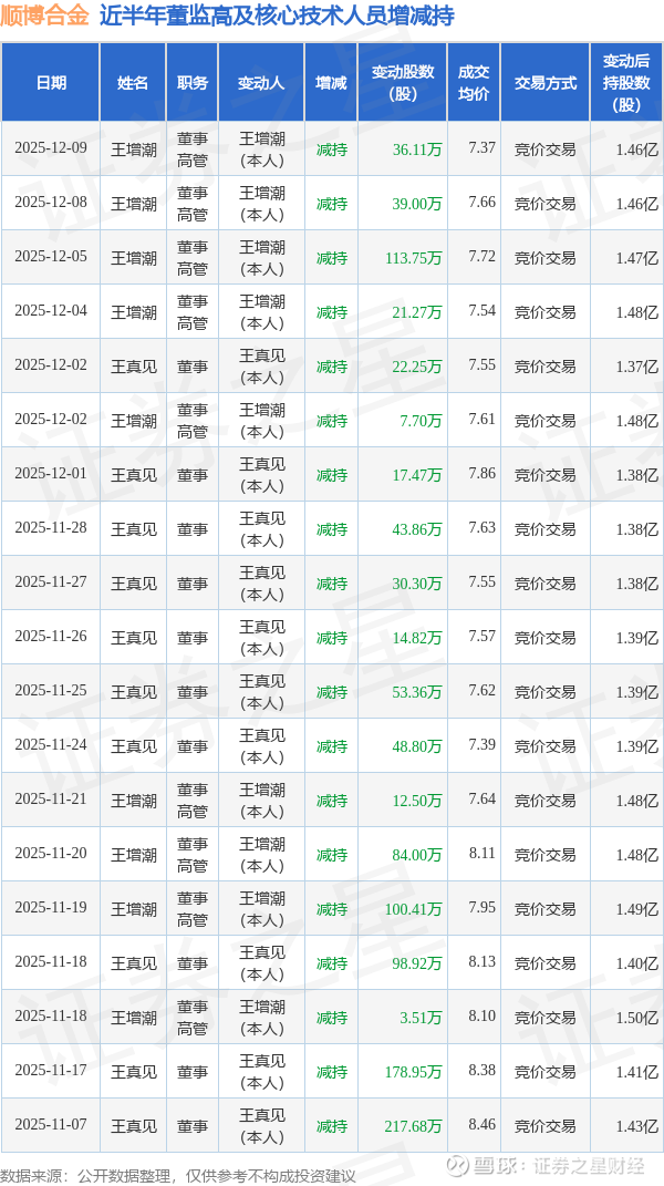 证券之星消息,根据12月10日市场公开信息、上市公司公告及交易所披露数据整理,顺博合金(002996)最新董监高及相关人员股份变动情况:2025年12月9日公司董事,高管王增潮共减持公司股份36.11万股,占公司总股本为0.0539%。变动期间公司股价下跌4.32%,12月9日当日收盘报7.31元。