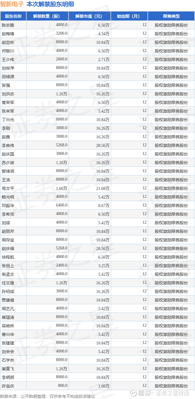 证券之星消息,根据市场公开信息整理,智新电子(920212)于12月11日将有27.01万股限售股份解禁,为公司股权激励限售股份,占公司总股本0.25%。(本次数据根据历史公告整理得出,实际情况以上市公司最新公告为准)本次解禁后,公司还有5456.72万股限售股份,占总股本51.43%。具体如下图所示: