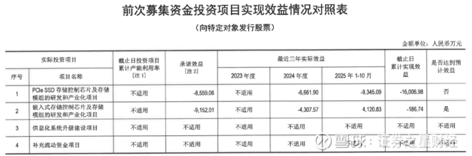 截至2025年10月31日,公司前次定增已累计使用6.97亿元的募集资金,投资进度为70.48%,尚未完工。同时,公司PCIeSSD研发及产业化、嵌入式存储研发及产业化两大项目尚未达产,累计实现效益分别为-1.61亿元、-186.74万元。