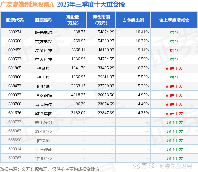根据2025基金Q3季报公募基金重仓股数据,重仓该股的公募基金共23家,其中持有数量最多的公募基金为广发基金的广发高端制造股票A。广发高端制造股票A目前规模为44.24亿元,最新净值1.4222(12月10日),较上一交易日下跌0.67%,近一年下跌1.44%。该公募基金现任基金经理为郑澄然。郑澄然在任的基金产品包括:广发鑫享灵活配置混合A,管理时间为2020年5月20日至今,期间收益率为47.71%;广发兴诚混合A,管理时间为2021年1月6日至今,期间收益率为-51.13%;广发诚享混合A,管理时间为2021年2月8日至今,期间收益率为-50.89%。