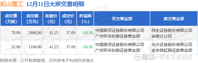 证券之星消息,12月11日拓山重工发生大宗交易,交易数据如下: