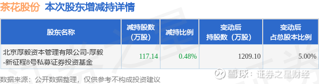 证券之星消息,12月11日茶花股份发布公告《茶花股份:简式权益变动报告书(厚毅-新征程8号私募证券投资基金)》,其股东北京厚毅资本管理有限公司-厚毅-新征程8号私募证券投资基金于2025年12月9日至2025年12月11日间合计减持117.14万股,占公司目前总股本的0.4844%,变动期间该股股价下跌2.86%,截止12月11日收盘报23.13元。
