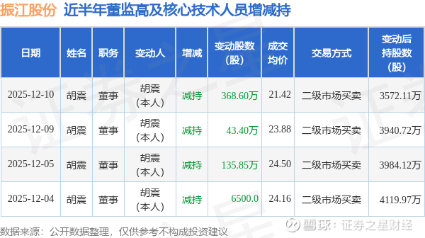 证券之星消息,根据12月11日市场公开信息、上市公司公告及交易所披露数据整理,振江股份(603507)最新董监高及相关人员股份变动情况:2025年12月9日至2025年12月10日公司董事胡震共减持公司股份412.0万股,占公司总股本为2.2355%。变动期间公司股价下跌1.78%,12月10日当日收盘报23.66元。