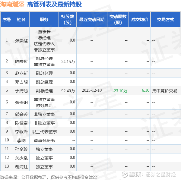 海南瑞泽的高管列表及最新持股情况如下: