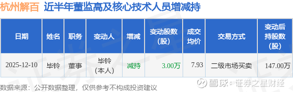 杭州解百近半年内的董监高及核心技术人员增减持详情如下: