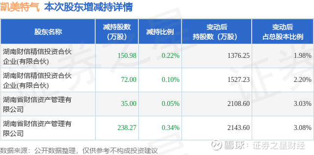 证券之星消息,12月11日凯美特气发布公告《凯美特气:关于股东及一致行动人减持计划实施完毕的公告》,其股东湖南财信精信投资合伙企业(有限合伙)、湖南省财信资产管理有限公司于2025年12月8日至2025年12月11日间合计减持496.25万股,占公司目前总股本的0.7136%,变动期间该股股价下跌0.05%,截止12月11日收盘报20.08元。