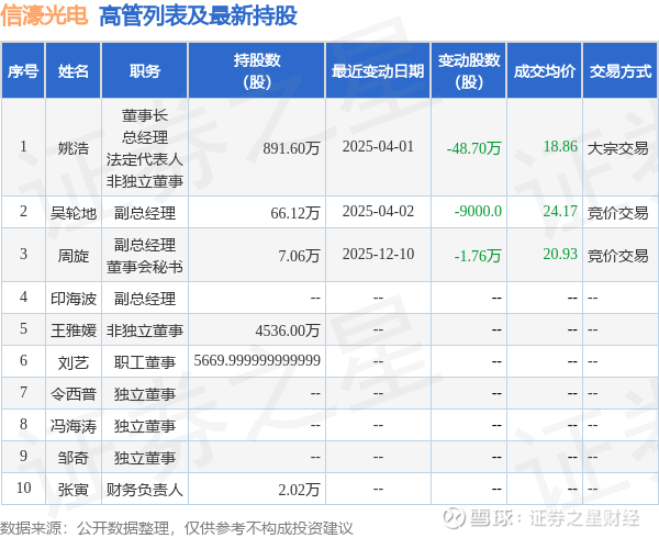 信濠光电近半年内的董监高及核心技术人员增减持详情如下: