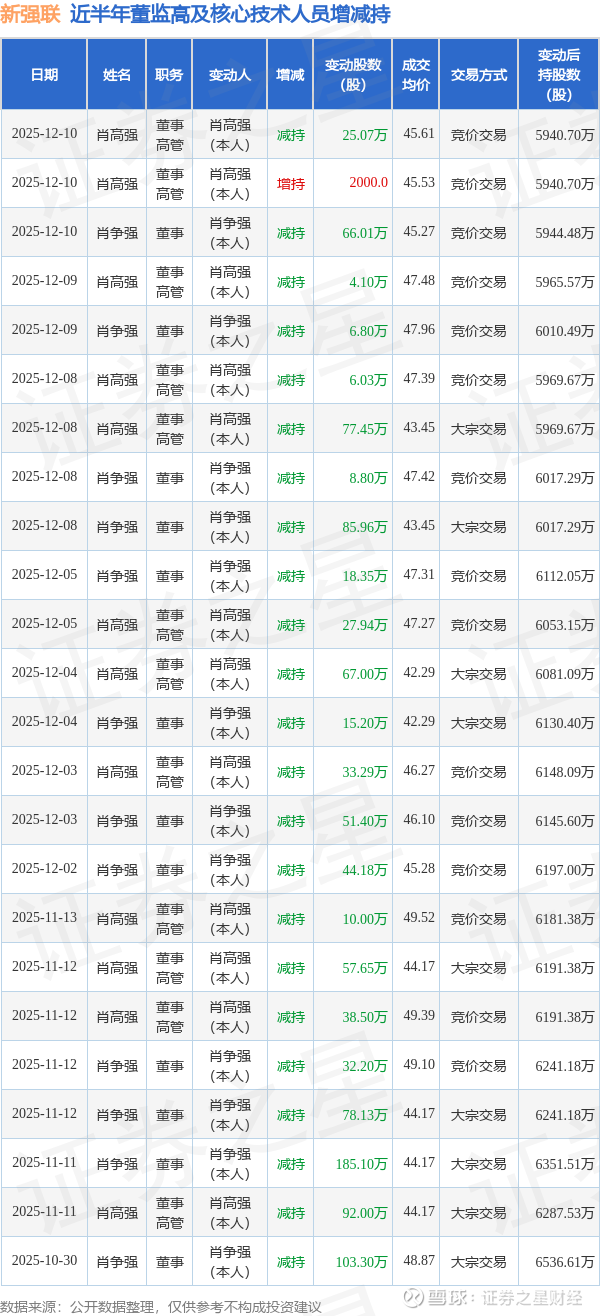 新强联近半年内的董监高及核心技术人员增减持详情如下: