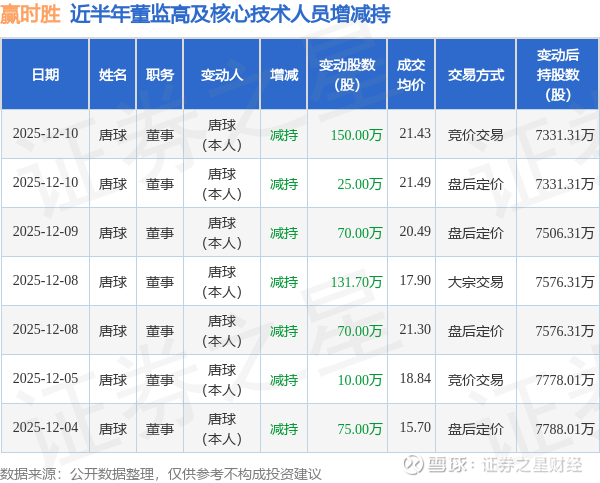 赢时胜近半年内的董监高及核心技术人员增减持详情如下: