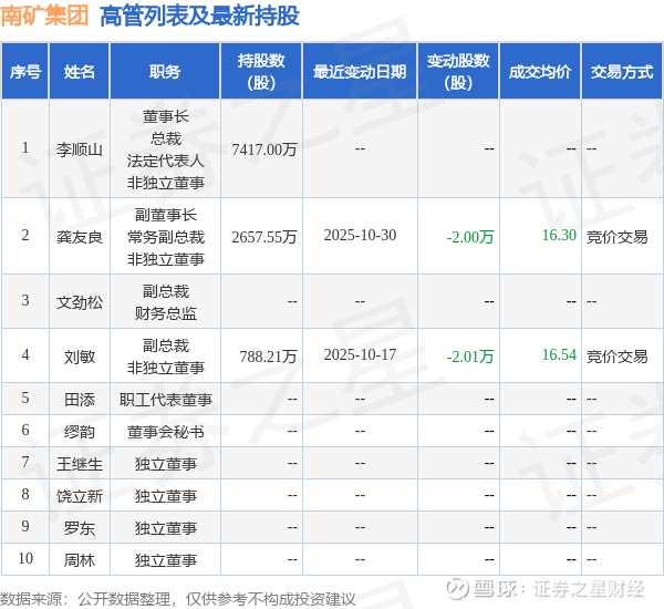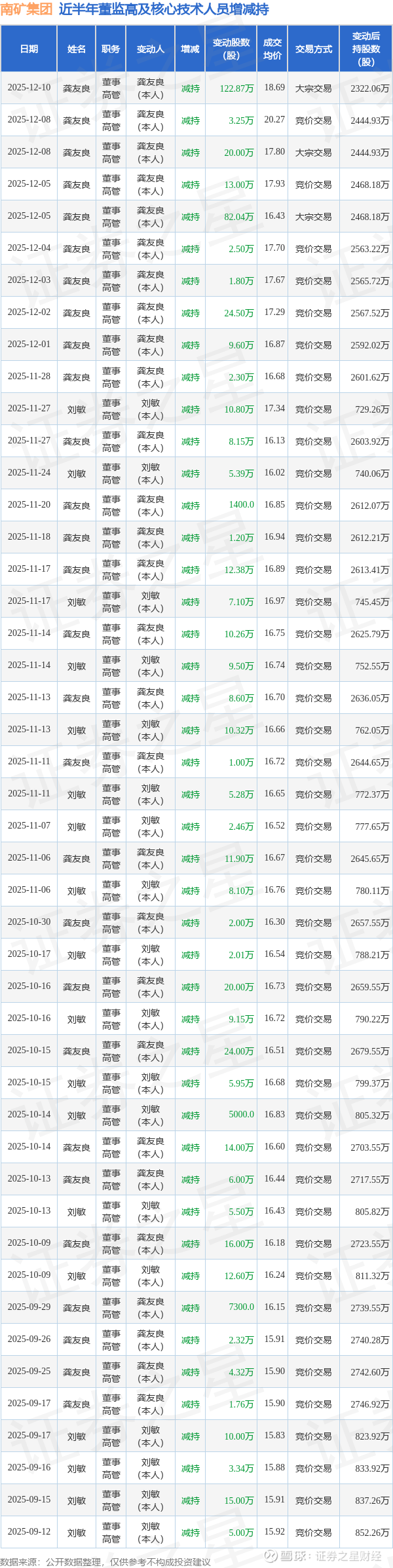 证券之星消息,根据12月11日市场公开信息、上市公司公告及交易所披露数据整理,南矿集团(001360)最新董监高及相关人员股份变动情况:2025年12月10日公司董事,高管龚友良共减持公司股份122.87万股,占公司总股本为0.6023%。变动期间公司股价上涨10.0%,12月10日当日收盘报22.77元。