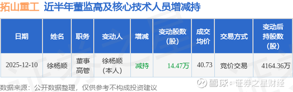 拓山重工近半年内的董监高及核心技术人员增减持详情如下: