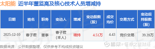 证券之星消息,根据12月11日市场公开信息、上市公司公告及交易所披露数据整理,太阳能(000591)最新董监高及相关人员股份变动情况:2025年12月10日公司董事曹子君共增持公司股份4.51万股,占公司总股本为0.0011%。变动期间公司股价下跌0.22%,12月10日当日收盘报4.45元。