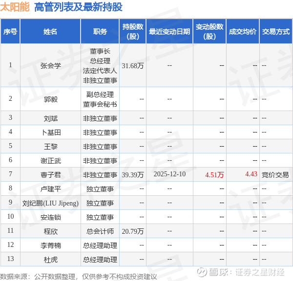 太阳能的高管列表及最新持股情况如下: