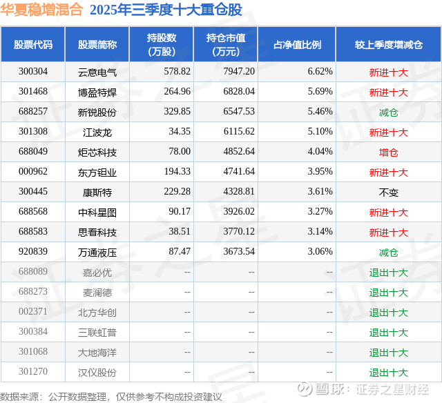 根据2025基金Q3季报公募基金重仓股数据,重仓该股的公募基金共3家,其中持有数量最多的公募基金为华夏基金的华夏稳增混合。华夏稳增混合目前规模为12.0亿元,最新净值3.45(12月11日),较上一交易日下跌0.78%,近一年上涨30.29%。该公募基金现任基金经理为彭海伟。彭海伟在任的基金产品包括:华夏景气成长一年持有混合发起式A,管理时间为2024年3月28日至今,期间收益率为53.32%。