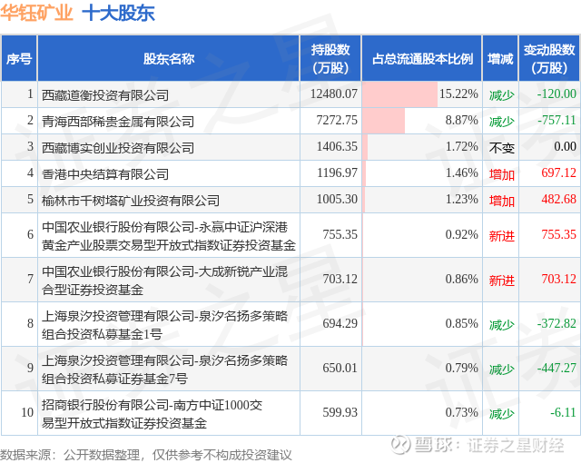证券之星消息,12月12日华钰矿业发布公告《华钰矿业:华钰矿业股东减持股份结果公告》,其股东青海西部稀贵金属有限公司于2025年9月17日至2025年12月12日间合计减持39.11万股,占公司目前总股本的0.0477%,变动期间该股股价上涨8.07%,截止12月12日收盘报27.6元。