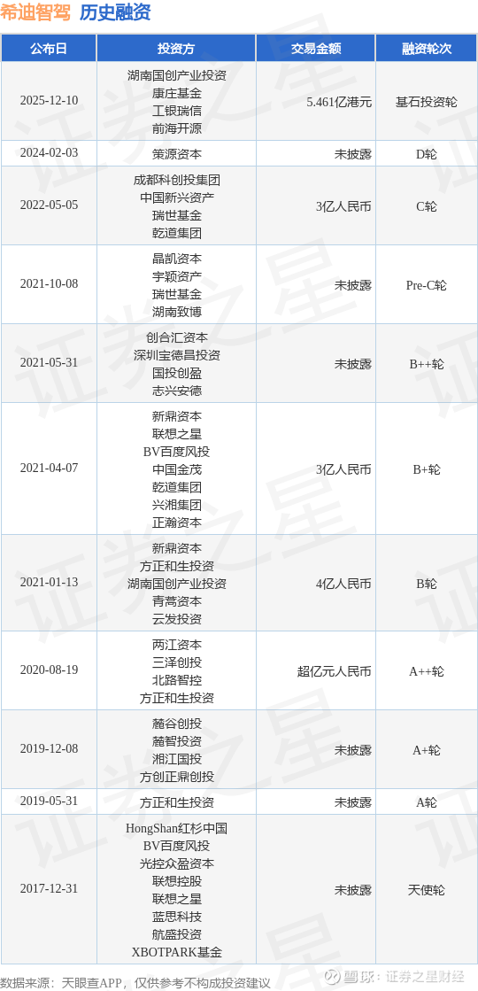 证券之星消息,根据天眼查APP于12月10日公布的信息整理,希迪智驾科技股份有限公司基石投资轮融资,融资额5.461亿港元,参与投资的机构包括湖南国创产业投资,康庄基金,工银瑞信,前海开源。