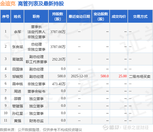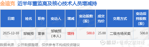 证券之星消息,根据12月12日市场公开信息、上市公司公告及交易所披露数据整理,金迪克(688670)最新董监高及相关人员股份变动情况:2025年12月10日公司董事邹镜预共增持公司股份500.0股,占公司总股本为0.0004%。变动期间公司股价上涨3.95%,12月10日当日收盘报24.99元。