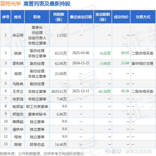 蓝特光学近半年内的董监高及核心技术人员增减持详情如下: