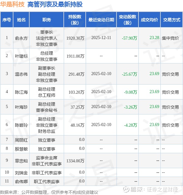华是科技近半年内的董监高及核心技术人员增减持详情如下: