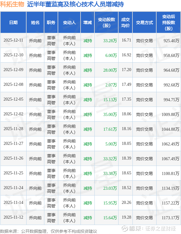 科拓生物近半年内的董监高及核心技术人员增减持详情如下: